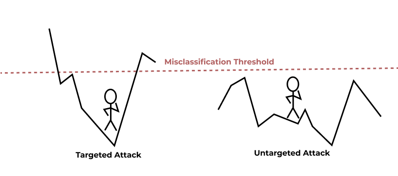 Finding targeted adversarial examples that transfer is much harder than finding untargeted examples that transfer (Liu et al., 2017). This is because it is much easier to drive the loss up when there isn't a constraint on the exact direction the loss should be moving upwards. In other words, the loss landscape for predicting a singular target class is less generous than the landscape for predicting any class other than the clean label. As a mental model, we propose you think about an individual attempting to climb up a mountain: in the untargeted case, it is easy to climb straight up while in the targeted case, it is unclear which direction to climb.
