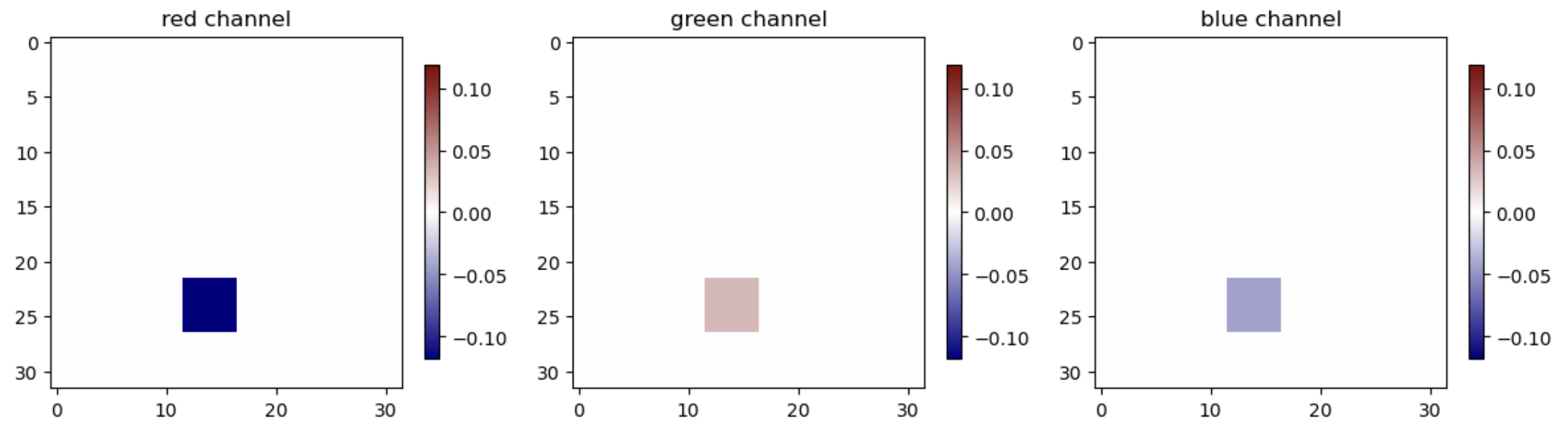 More concretely, can be visualized below assuming an input image with pixels and 3 color channels. Note that although each color channel has the same square location, the value of the change at each color channel is different.