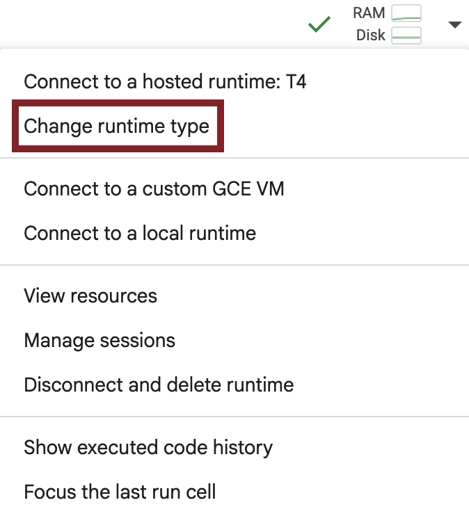 In order to get the advantages of Colab you will have to pay careful attention to the runtime you connect to. At the top right corner you should find a dropdown with an option to “Change runtime type.” You are free to play around with the different options, but as long as you select a machine that is not “cpu” you should be fine.